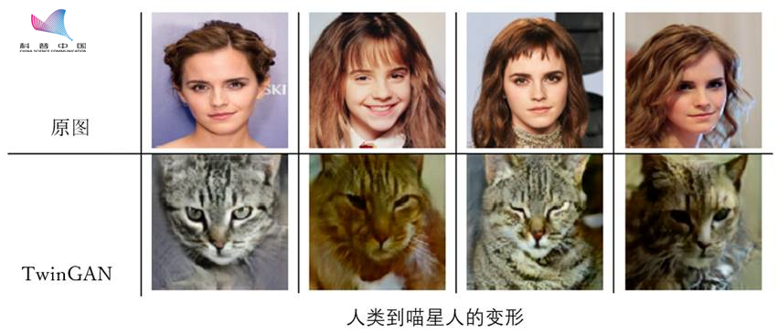 除了最基本的GAN模型,目前为止,已经有许多不同的变形算法被开发了出来,比如下面这个例子,输入人类表情以后,可以生成同表情的喵星人,是不是很酷的感觉。以后让喵主人跟自己做同款表情包也是指日可待了。